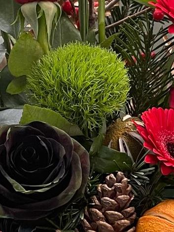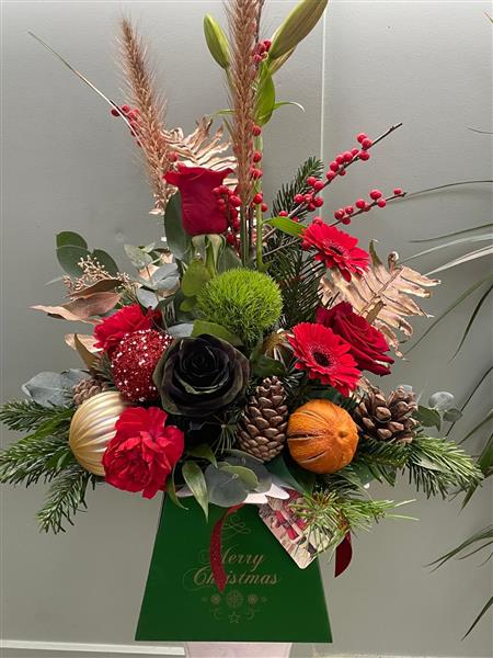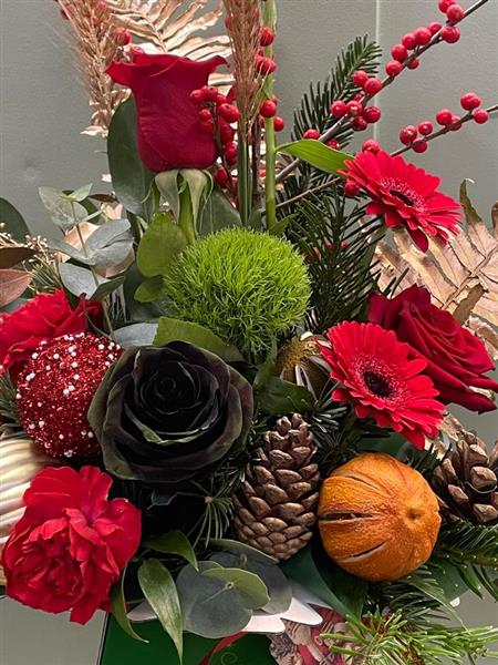This elegant Christmas arrangement features a mix of festive elements, including red roses, gerbera daisies, carnations, and a unique Green rose. Accented with pinecones, a dried orange slice, glittering ornaments, golden foliage, eucalyptus, and lush evergreens, it is beautifully complemented by sprigs of berries and Golden Fox tails.