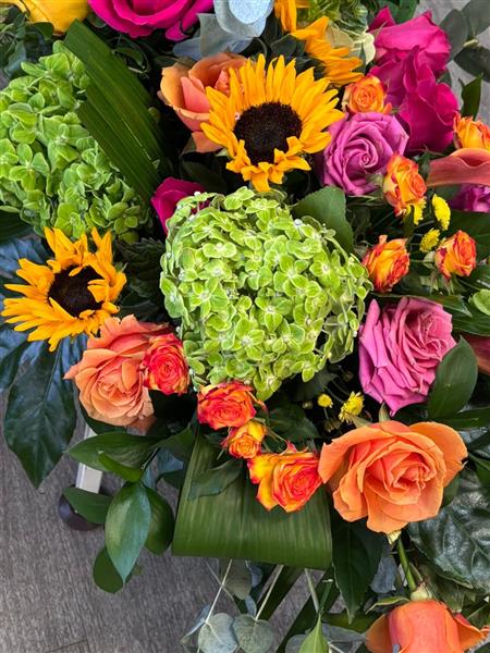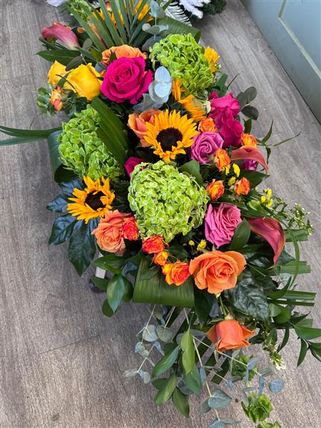 A bright casket spray full of vibrant, long-lasting blooms, designed to sit gracefully atop the coffin. A heartfelt tribute that celebrates a life with colour, love, and remembrance.