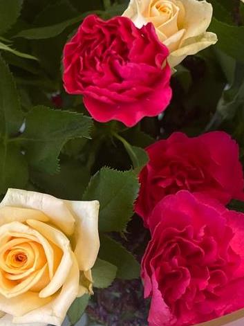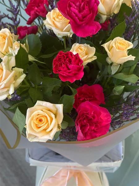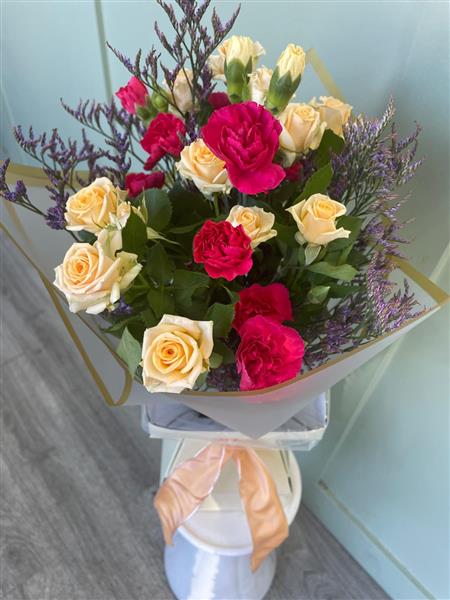 The Gesture Bouquet features a beautiful combination of cerise spray chrysanthemums and peach spray roses, creating a soft, vibrant, and thoughtful arrangement. The rich cerise chrysanthemums offer a bold pop of colour, while the peach roses add warmth and elegance. This bouquet is perfect for expressing love, gratitude, or sympathy with a simple yet meaningful gesture.