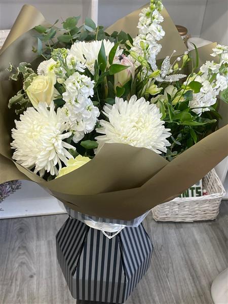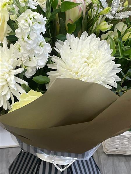 The bouquet is a radiant blend of soft, pure white blooms, each petal delicate and full of elegance. The flowers are complemented by subtle hints of glistening accents that catch the light, adding an ethereal sparkle. This arrangement creates a sense of serenity, with an enchanting glow that radiates both simplicity and sophistication. The texture of the petals contrasts gently with the shimmering elements, bringing depth and a touch of magic to the overall composition. It feels like a breath of fresh air, both timeless and contemporary.