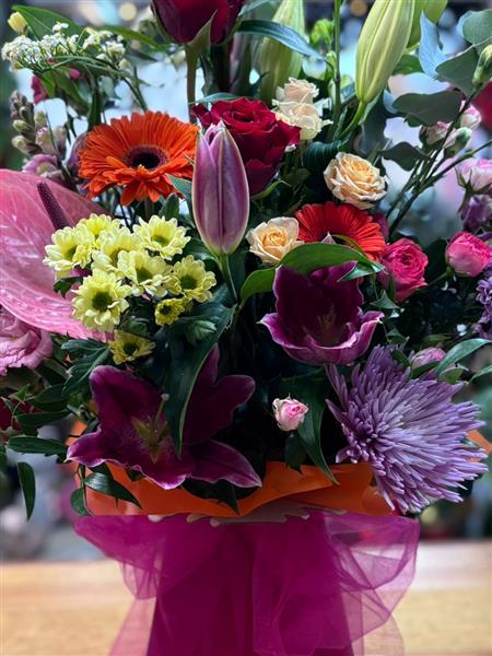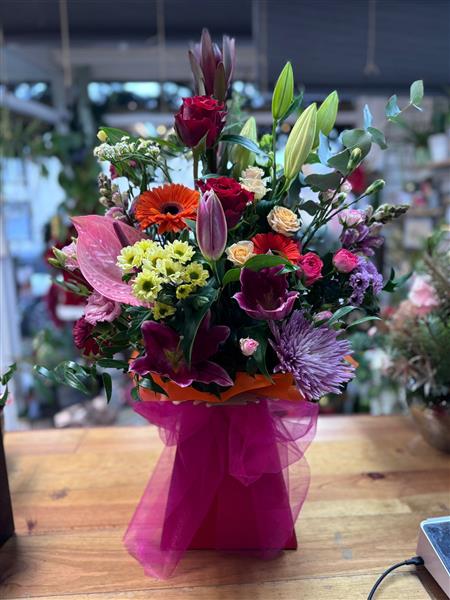 A bright, cheerful box arrangement designed in oasis, ready to simply pop on a side table or desk. This style of arrangement is perfect for sending to someone who needs a little lift, as it’s easy to display, low-maintenance, and instantly brings colour and happiness into any space. Its compact design makes it ideal for homes, hospitals, or workplaces, offering a thoughtful burst of joy without any fuss.