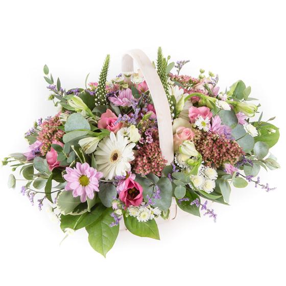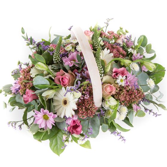 A pastel collection of dainty blooms in pinks, whites and lilacs, including roses, sedum, limonium, wax flower and lisianthus.