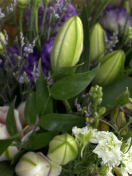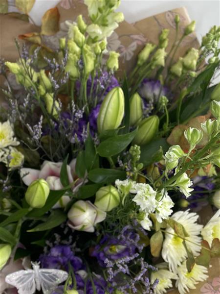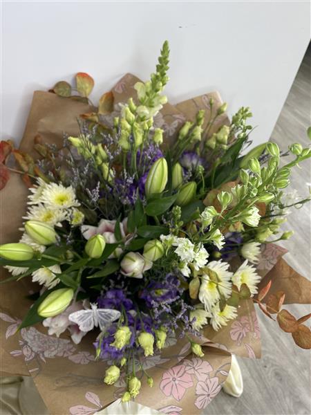 This country-style bouquet, wrapped in rustic brown paper, blends classic elegance with a touch of wild charm. It features crisp white lilies, chrysanthemums, and delphiniums, paired with delicate purple lisianthus and vibrant blue thistle for a pop of colour. Accents of copper foliage add texture and warmth, creating a naturally charming and visually rich arrangement.