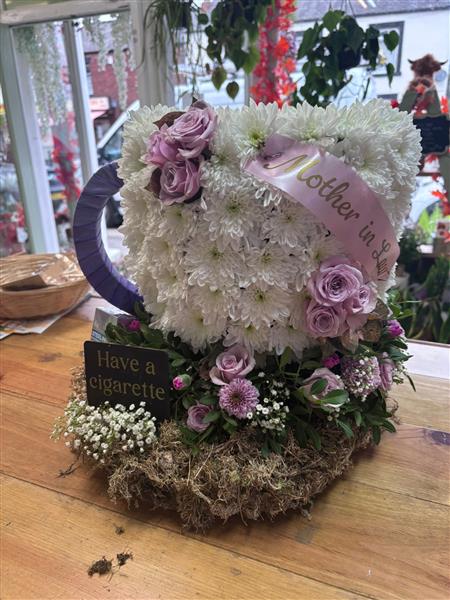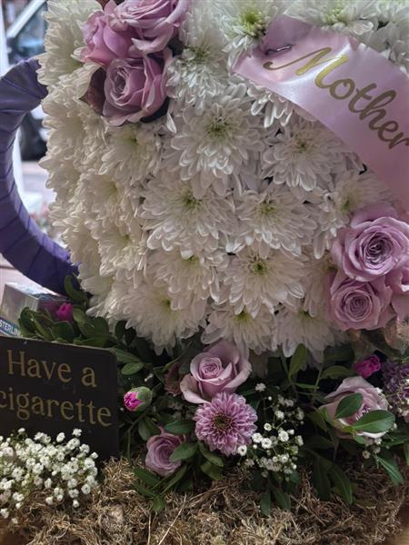 Our cup of tea and cigarette tribute is a heartfelt and personal design, created to celebrate those quiet, familiar moments shared with a loved one. Thoughtfully arranged with fresh flowers and incorporating real cigarettes for that ‘one last smoke together, this tribute beautifully captures the essence of everyday comfort and companionship. A fitting way to honour someone who enjoyed life’s simple pleasures and left behind cherished memories. Can be created without cigarettes for non-smokers