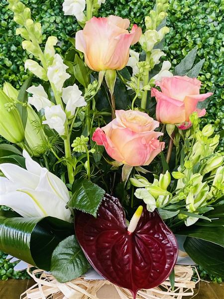 In contrast, bold, deep red anthuriums with their sleek, waxy texture and heart-shaped form create a focal point near the center. Their vivid hue adds a dramatic, luxurious feel to the arrangement, beautifully balanced by the purity of large, open white lilies. The lilies, with their trumpet-shaped blossoms, lend a sense of elegance and softness,