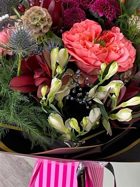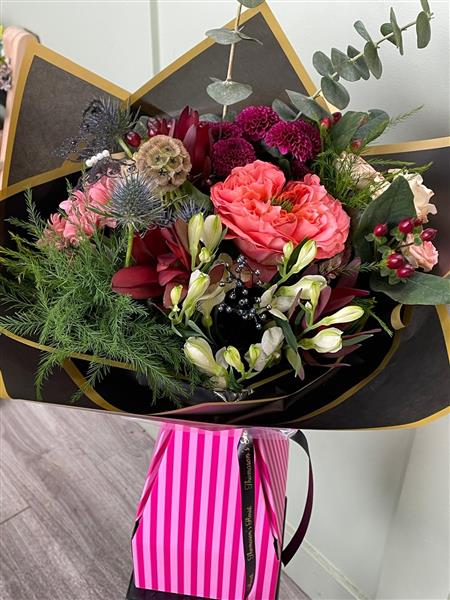 Our Florist Choice Bouquet, presented in a sleek, stylish box, features a unique selection of fresh seasonal blooms expertly arranged for any occasion. Simple, elegant, and unforgettable.