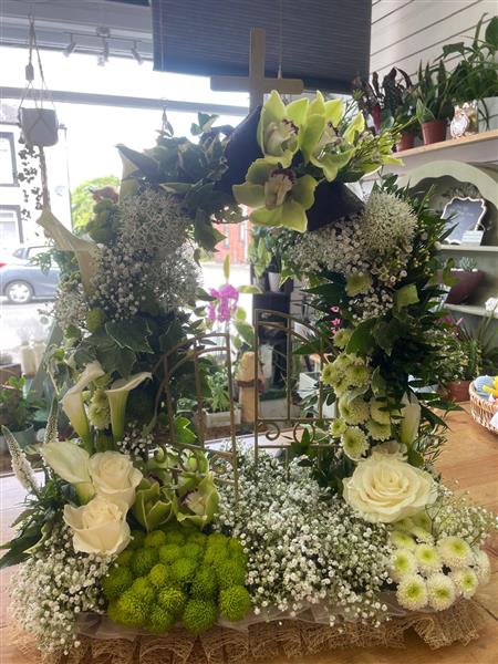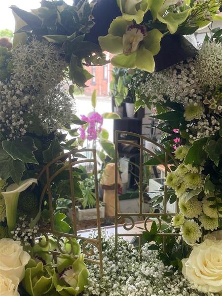 This beautiful “Gates of Heaven” floral tribute features a graceful open gate framed with elegant white roses, orchids, lilies, chrysanthemums, and delicate sprays of gypsophila. Accented with fresh greenery and a golden cross, it symbolizes peace, purity, and eternal rest perfect for a heartfelt farewell.