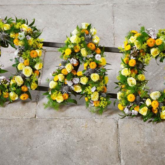 3 Letter tribute. Each letter is crafted with vibrant yellow and white flowers, including roses, chrysanthemums, and complementary greenery. The arrangement is designed on a black or Green framework, providing a sturdy and elegant base.