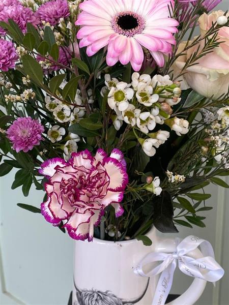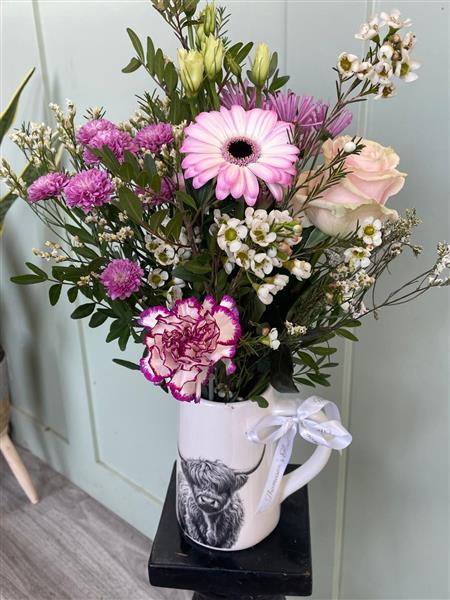 This beautiful floral arrangement is perfect for Highland cow lovers, featuring a charming mix of pastel blooms in a unique ceramic jug with a Highland cow design. With soft pink gerberas, blush roses, purple chrysanthemums, and delicate waxflowers, it’s a rustic yet elegant gift for any occasion.