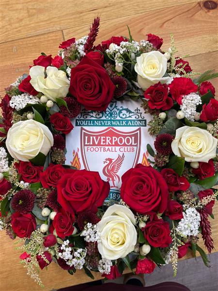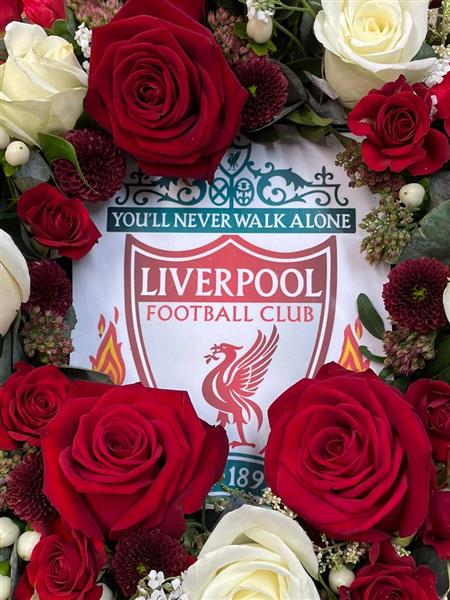 This striking wreath is a heartfelt tribute for a devoted Liverpool supporter. Crafted with passion and care, it features a vibrant mix of Reds and pure whites, Nestled at its heart is the official Liverpool FC crest, honouring a life lived with loyalty and pride.