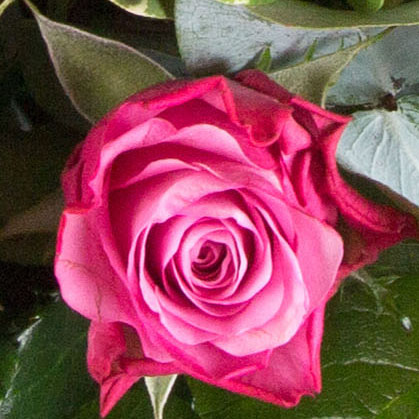 A dozen classic long stemmed pink roses mingled with mixed foliage presented in water.