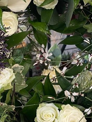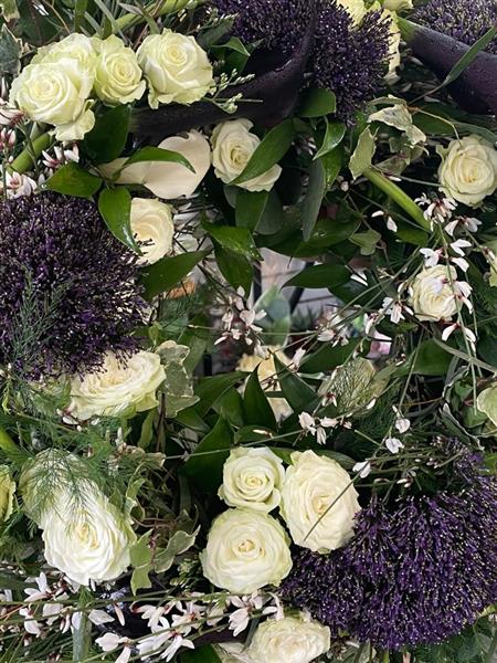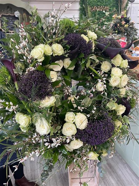 A striking large and elegant funeral wreath with a natural, untamed feel. Soft ivory tones rest gently against rich, deep purples, brought together with textured greenery and delicate sprigs that spill organically from the form. This arrangement balances boldness and softness, creating a sense of calm remembrance with a wild, meadow-like charm. A beautiful tribute full of depth, grace, and quiet strength.