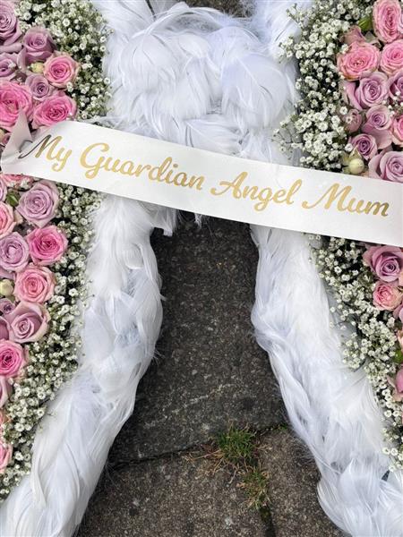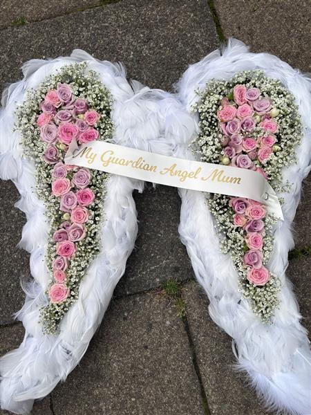 Our stunning large angel wings, adorned with delicate white feathers and centred with roses, offer a beautiful tribute to your loved one. Custom colours available to suit your style