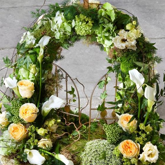 A funeral piece designed as the “Gates of Heaven” with Cala lilies, peach roses, and ivy entwined creates a serene and symbolic representation of a passage to the afterlife.