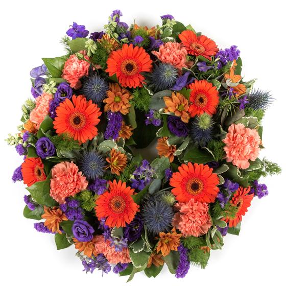This traditional wreath combines deep purples and oranges to create a masculine tribute.