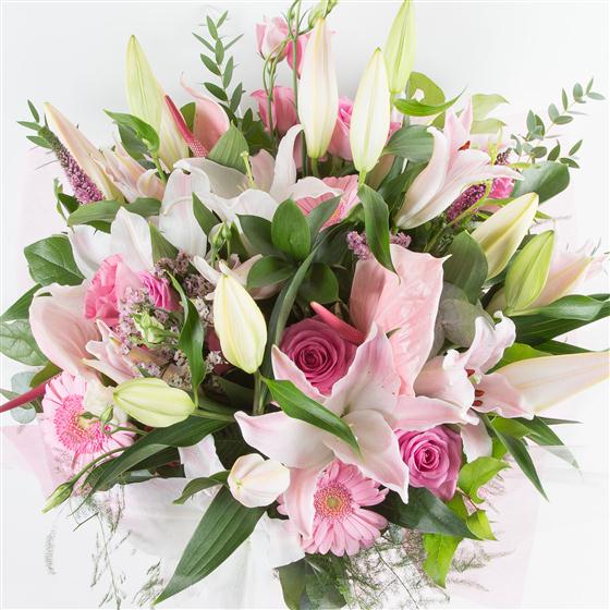 A sophisticated array of fragrant pink lilies, lime foliage, anthuriums and roses make this a stylish choice.