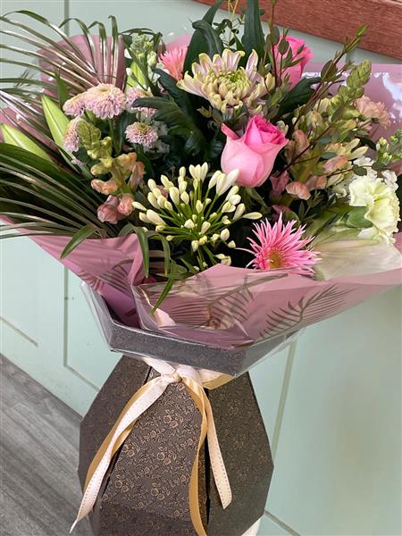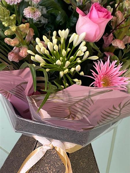 This stunning bouquet from your prestige range is an elegant arrangement of soft pastel pink tones complemented by vibrant greens. The design features a mix of delicate blooms and lush foliage, beautifully wrapped in pink-toned paper and displayed in an ornate patterned box with a ribbon for an added touch of luxury. The arrangement exudes sophistication and is perfect for making a memorable impression.