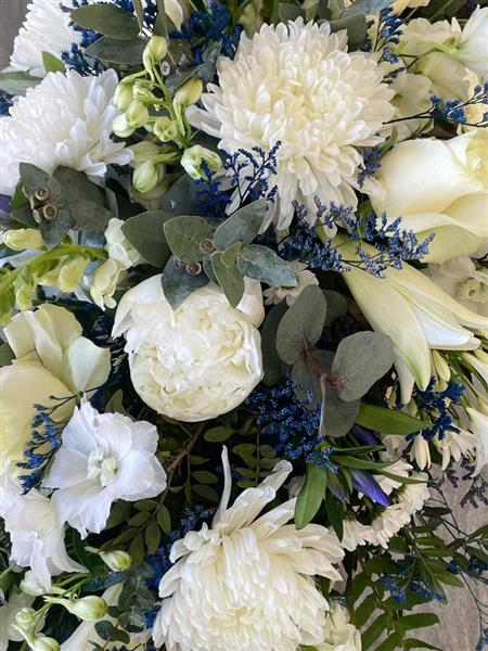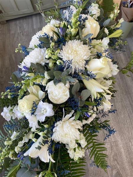 A serene and elegant tribute, the Peaceful Reflections Casket Spray features a soothing palette of white roses, lilies, chrysanthemums, and snapdragons, delicately accented with soft blue lim and lush greenery. Thoughtfully arranged to convey comfort and remembrance, this design is especially well suited to honoring a beloved gentleman with grace and dignity.