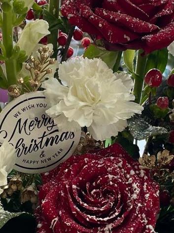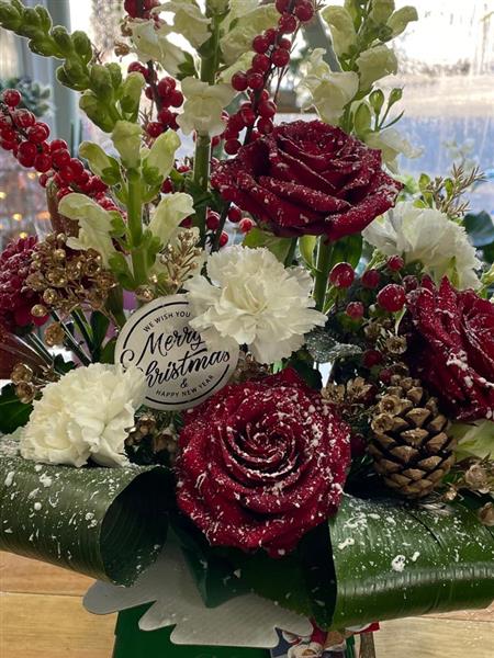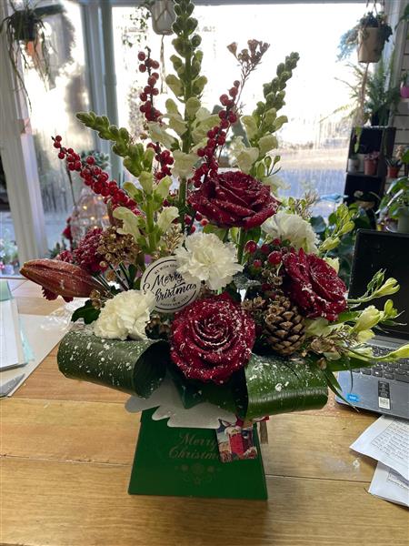 “A stunning Christmas box arrangement featuring red berries, Naomi red roses, red lilies, a touch of snow, and other festive holiday blooms.