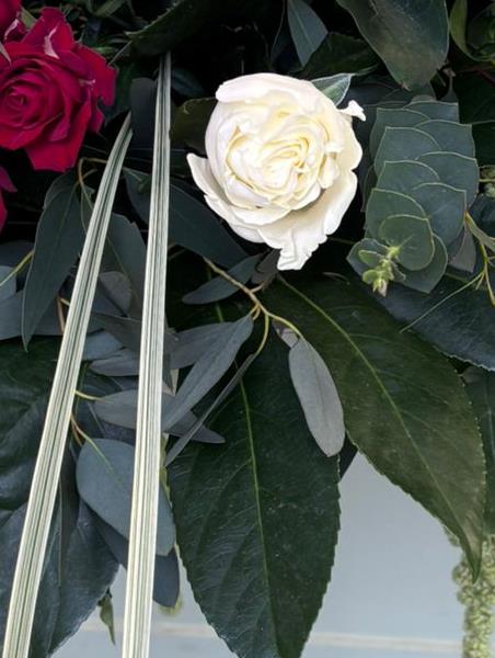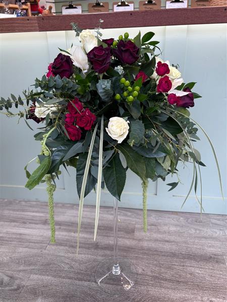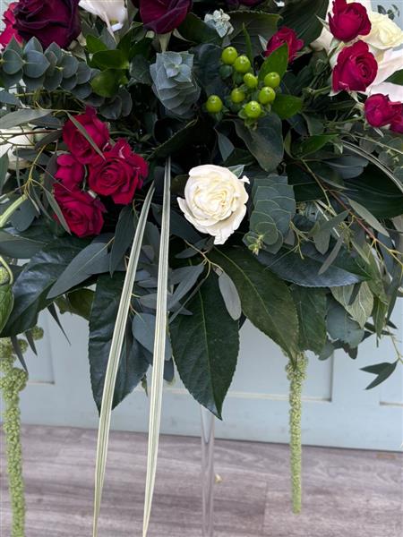 Featuring flowing eucalyptus paired with rich dark red roses and soft white roses, this design perfectly balances drama and elegance. The cascading foliage adds movement and romance, while the striking height and structure give it a show-stopping presence ideal for events, entrances, and luxury celebrations.