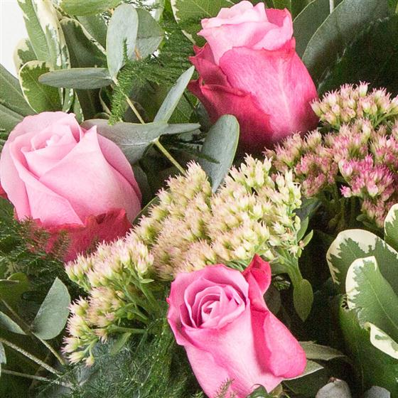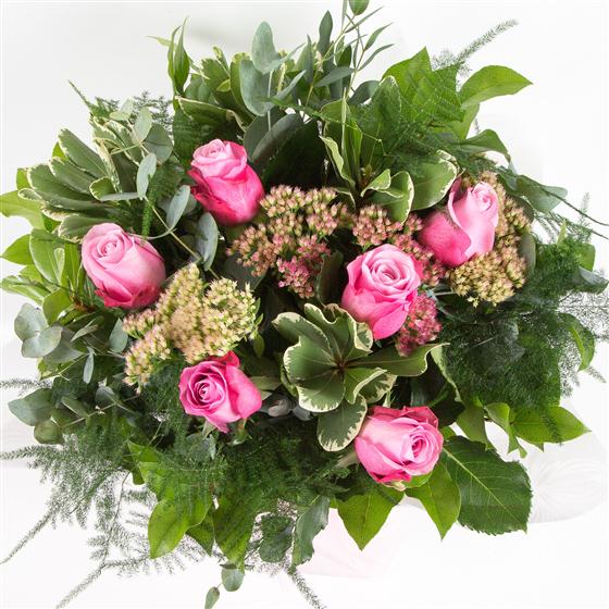 A hand-tied bouquet of six long stemmed pink roses encased in a selection of greenery.