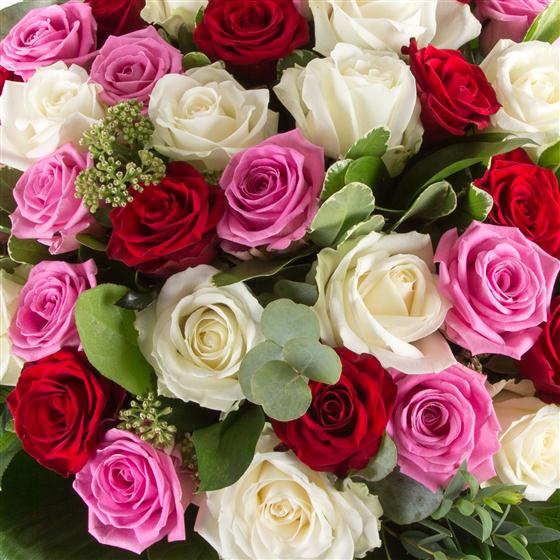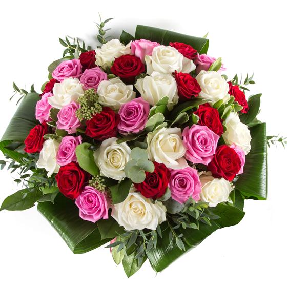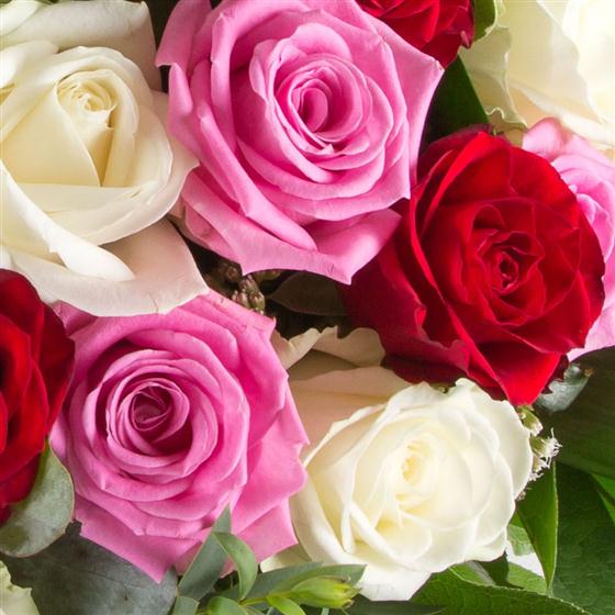 A show stopping hand-tied bouquet of 24 closely bound roses in pink, red and white. Vase not included.
