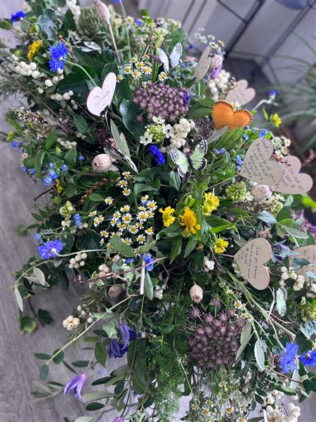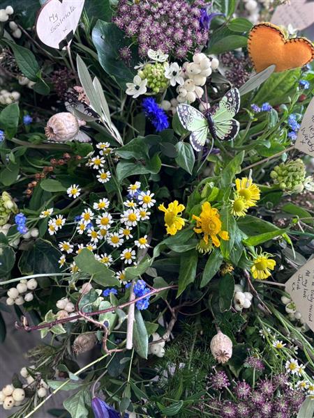 Wild Whispers is a beautifully natural casket spray, designed to feel as though it has been gathered from a peaceful meadow. Featuring delicate wildflowers, soft foliage, and subtle seasonal textures, this arrangement speaks quietly of love, remembrance, and the beauty of life’s fleeting moments.